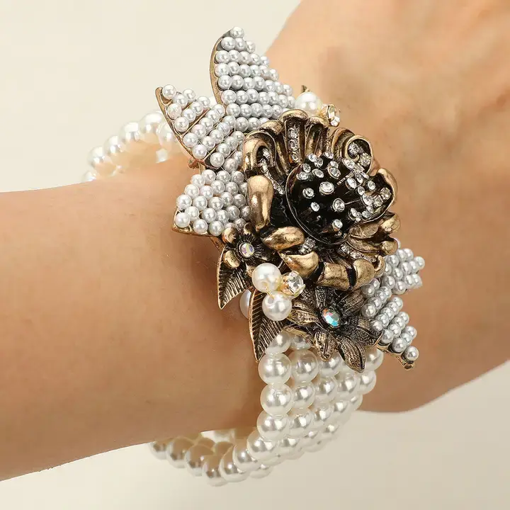 Vintage Floral Pearl Multi Strand Stretch Bracelet